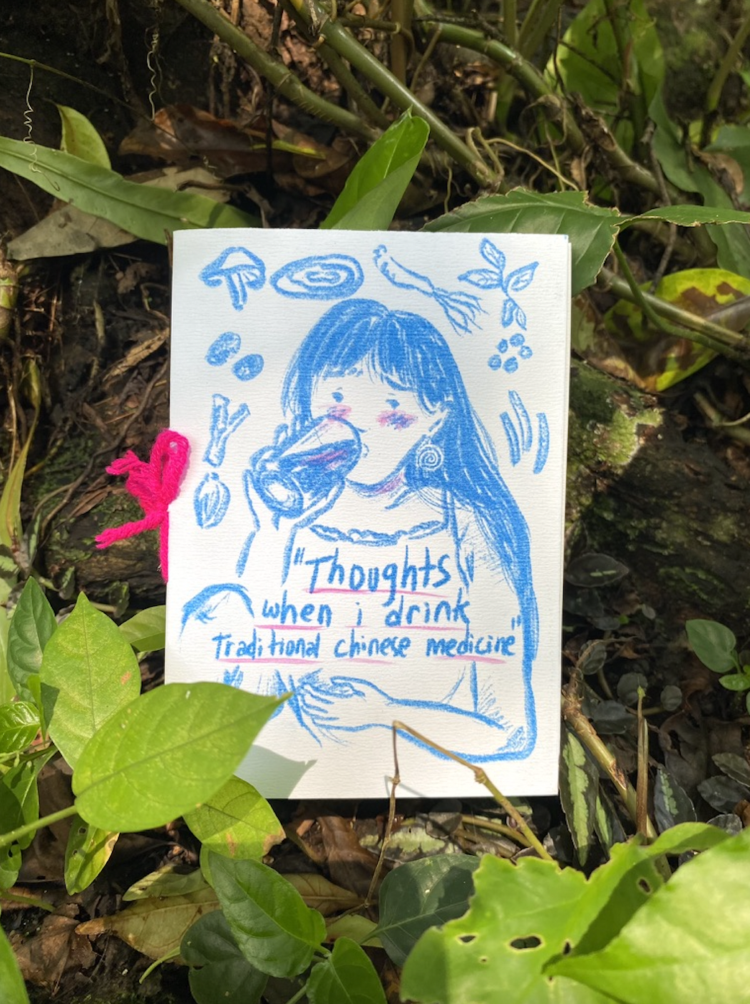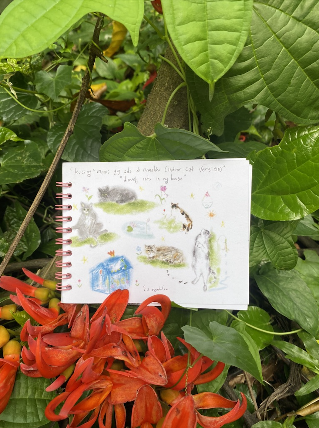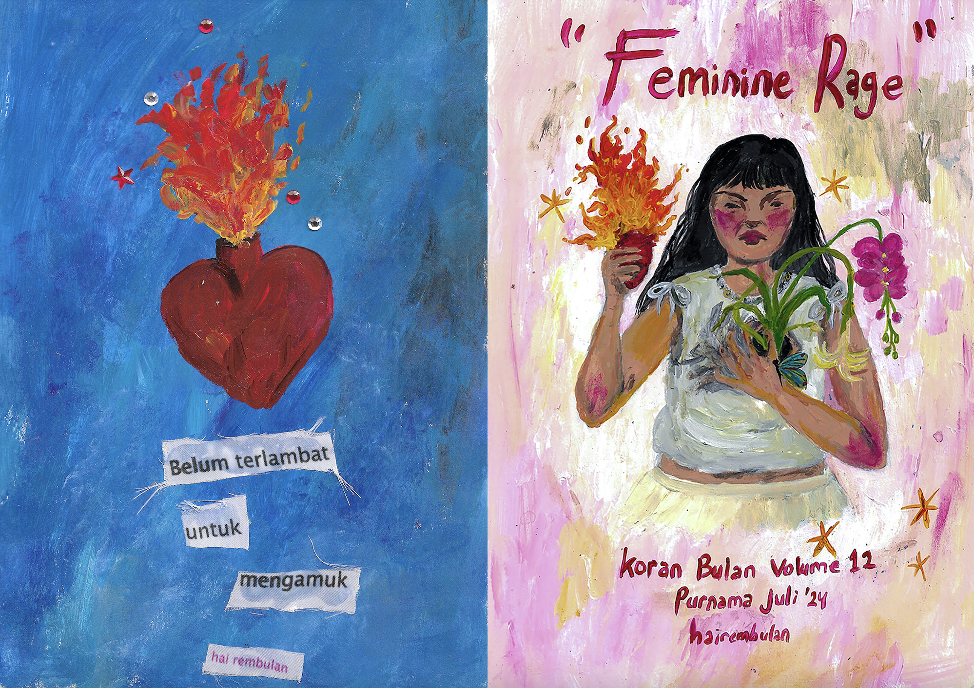 hai rembulan (she/her) is the name that serves as a home for her works of art and handicrafts. Since 2013, hai rembulan has been actively producing zines and has made more than 70 to date. Her work also delves into the relationship between humans, animals and nature, spirituality, ancestors, nostalgia, and stories from her childhood. Rather than confining herself to a single medium, hai rembulan enjoys experimenting with various mediums and techniques. In addition to zines, she operates a small shop where she sells paintings, hand-painted and hand-embroidered linen clothing, hand-build ceramic, wood work, handmade merchandise, trinkets, and local vegetarian food she prepares. hai rembulan is also a co-initiator of Kongsi 8, a concept and studio store established in 2021 in East Jakarta. Hai Rembulan is active in the art scene as a facilitator of zine workshop, speaker, and activist. She has been working with several musicians, writers, and media. She has just held her very first solo exhibition in Mimilu, Bandung. The title of her solo exhibition is “Keluk Di Mimpi, Luhur Di Hari-hari (Spiralling)” she made 41 new artworks in various mediums such as painting on canvas, plates, vases, mug, and hand embroidery on used curtains.