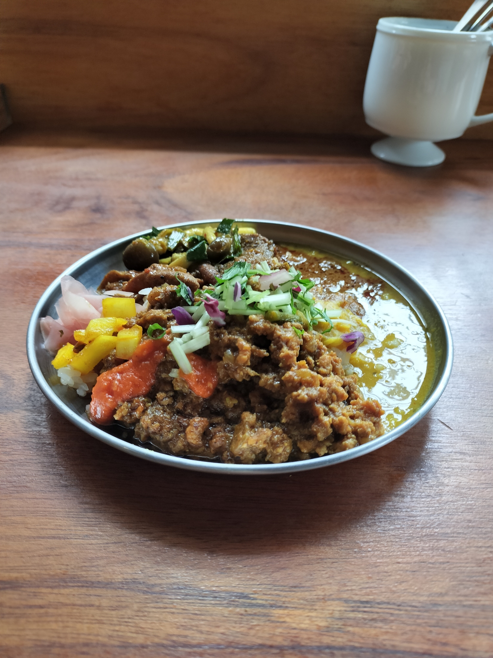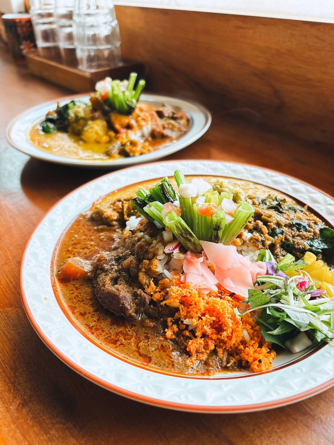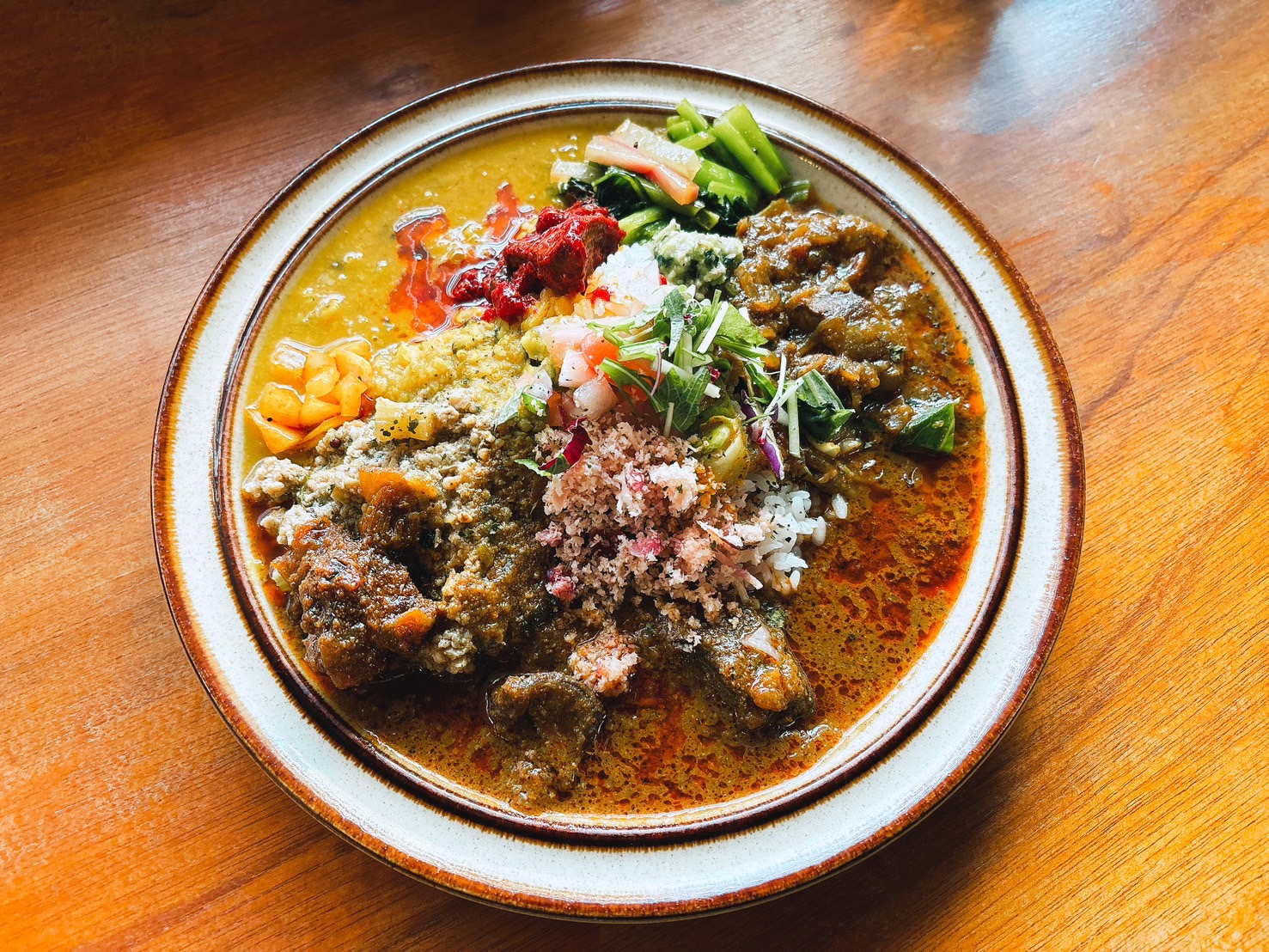 大阪北浜にある街のカレースタンド。スパイスフルで親しみ感じる一皿は、幅広いお客様へのパワーチャージに貢献!ランチでは、定番や日替わりカレーから好みでチョイスするコンボ(3種盛)がオススメ。*11/1、2のみ出店
