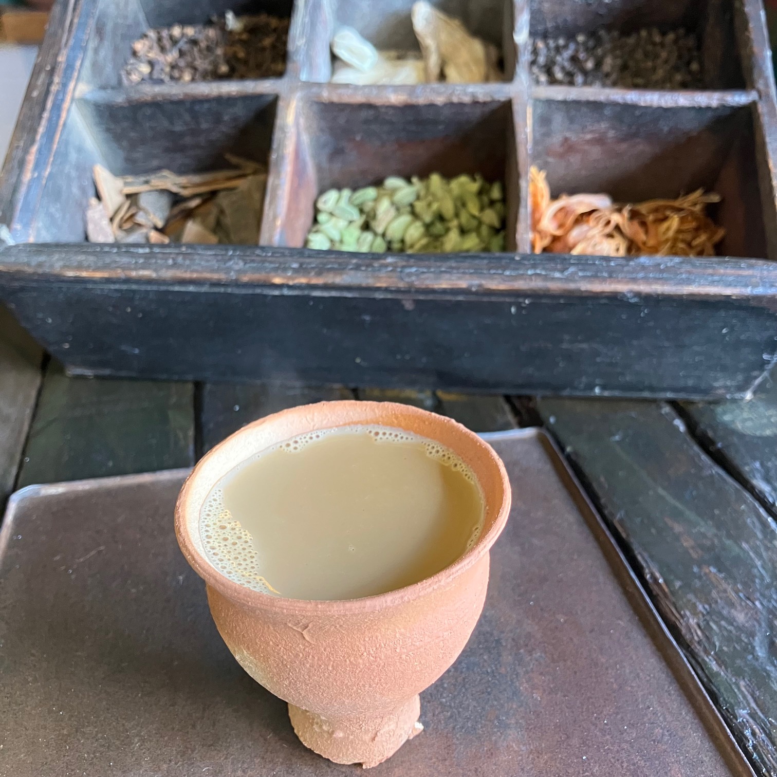 南インドのスパイスをたっぷり使って作る甘くて熱いチャイを素焼きのカップでお出しします。