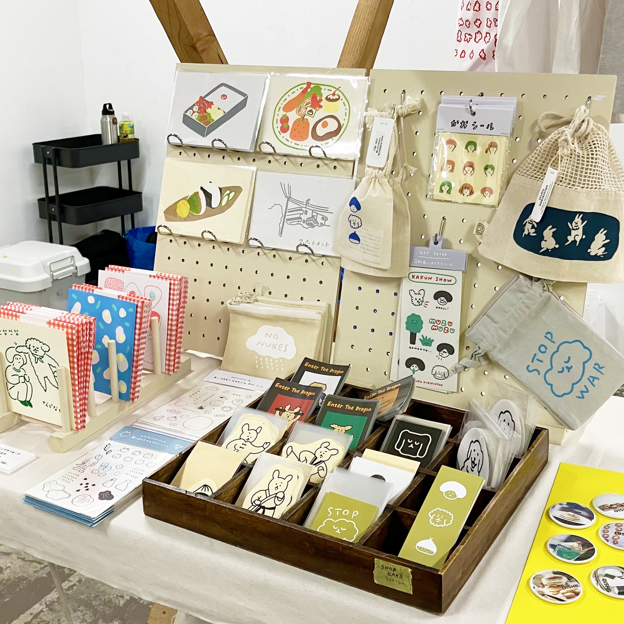 シルクスクリーンプリントを施したポーチ・バッグ・ポストカードや、ゆるーいステッカーなどを販売します。