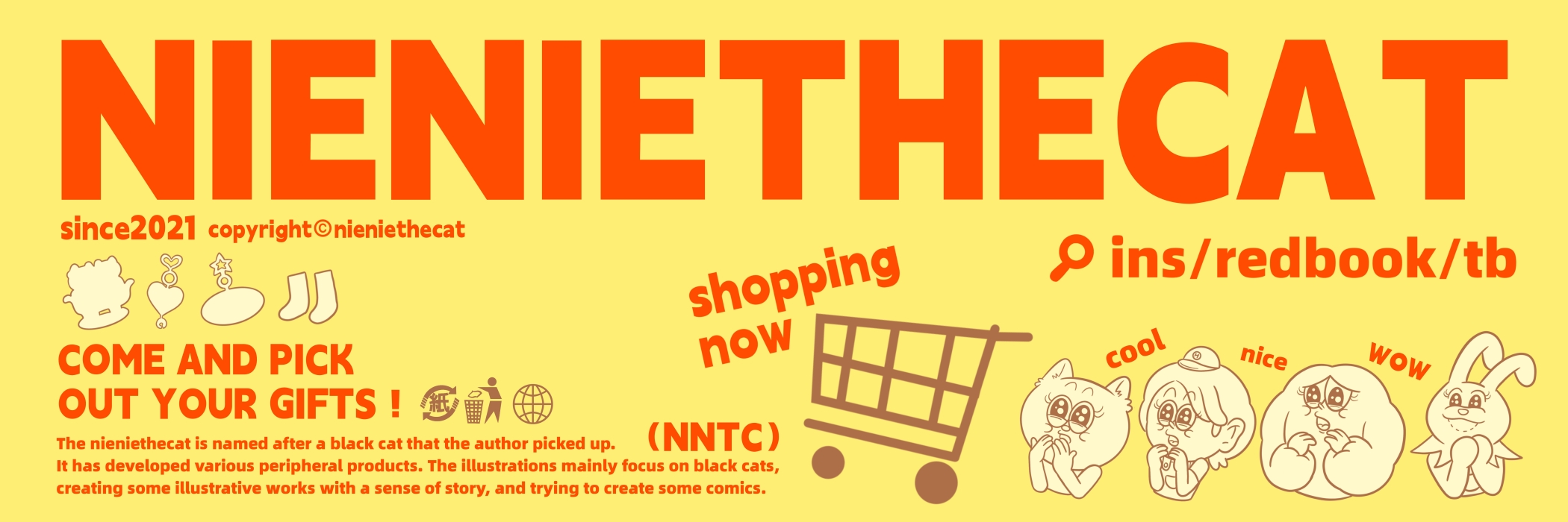 I’m good at creating American-style illustrations. My brand name is nieniethecat.The nieniethecat is named after a black cat that the author picked up. It has developed various peripheral products. The illustrations mainly focus on black cats and white cloud people, creating some illustrative works with a sense of story, and trying to create some comics.