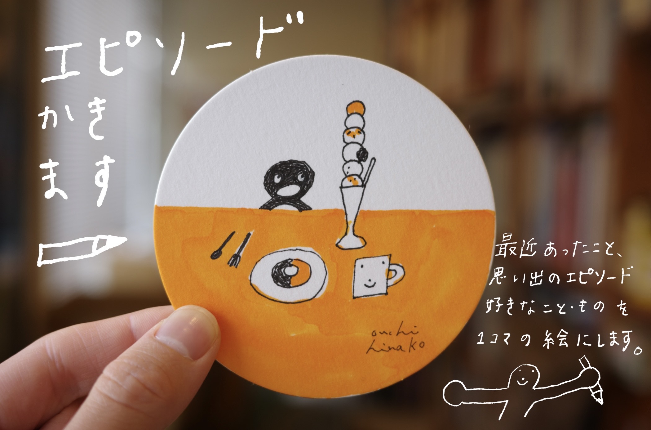 イラストレーターのおおうちひなこです。「エピソード描きます!」やります。好きなことやもの、最近あった嬉しかったことなど、あなたのエピソードを絵にします!オリジナルグッズの販売も行います。