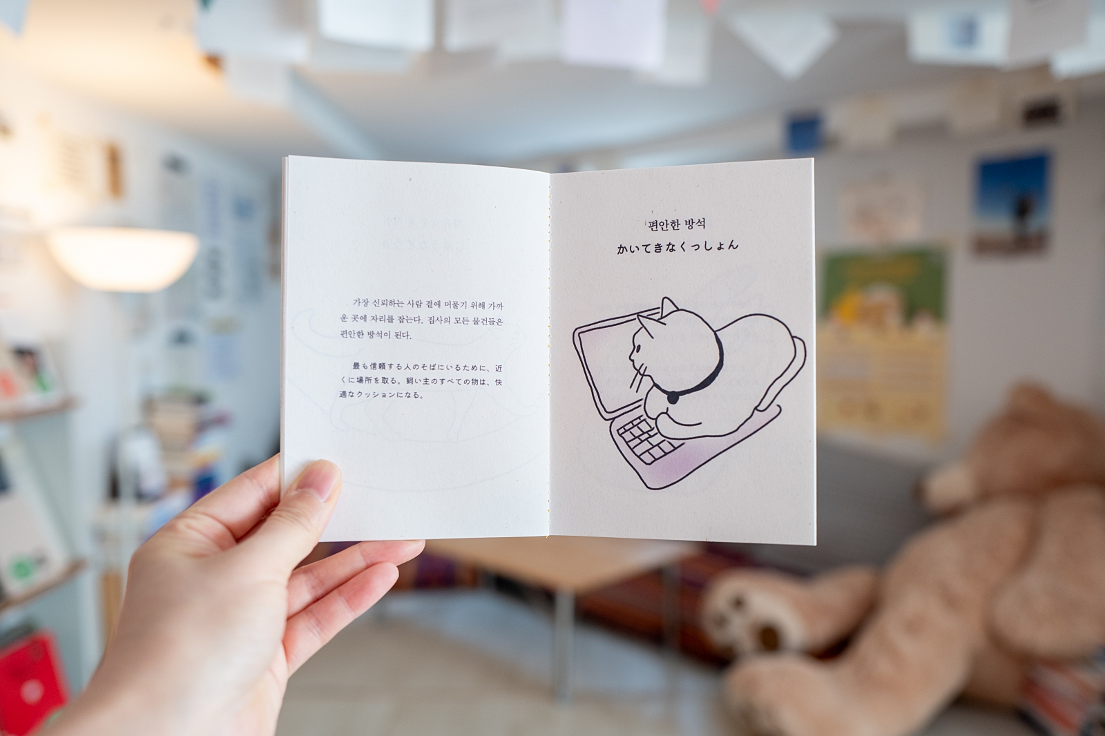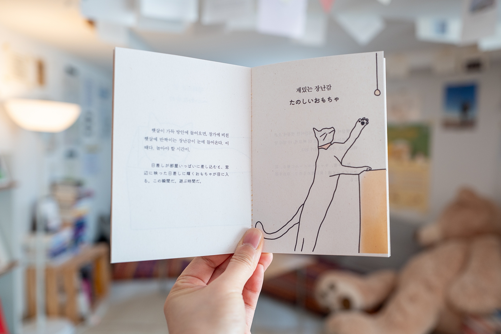 ねこのちいさなしあわせ。/ KIM JI SUN : 猫の幸せな7つの瞬間を収めた16ページのジン。セルフプリントとセルフバインディングで制作した手作りアートブック。韓国語と日本語で表記されたジン。